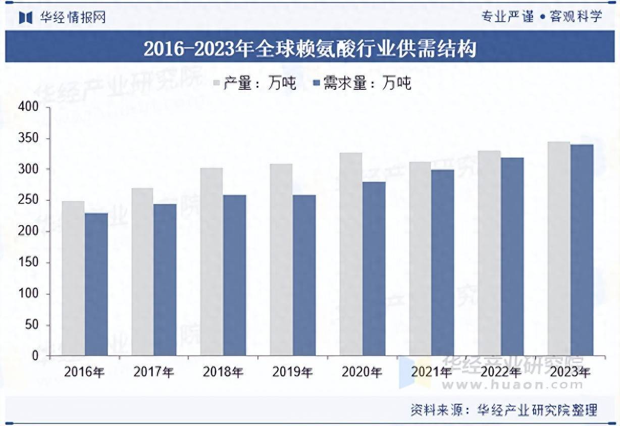 全球赖氨酸行业的市场供需结构呈现出明显的区域性和集中性。主要生产集中在中国、美国和巴西等畜牧业发达国家和地区能加杠杆的炒股软件,中国是全球最大的赖氨酸生产和出口国。需求方面,赖氨酸主要用于动物饲料,尤其是在猪、禽类和水产养殖中需求量大。随着全球对动物蛋白质需求的增加,赖氨酸的市场需求保持增长态势。2023年全球赖氨酸行业产量约为346万吨。